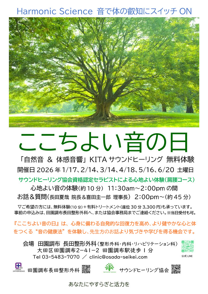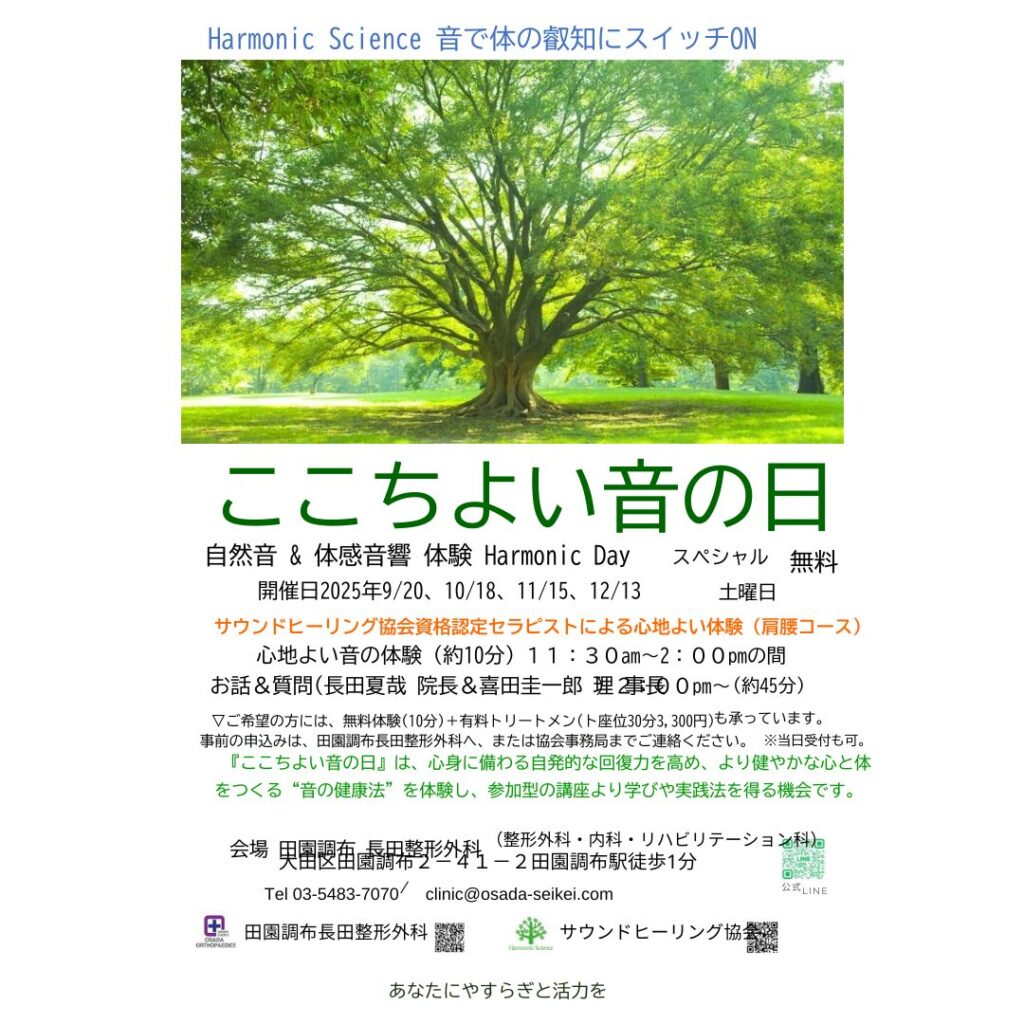 このイベントは、田園調布 長田整形外科と連携しながら、医療の視点とホリスティックな癒しの両面から「音の健康法」を体験できる特別な時間です。どなたでも無料でご参加いただけます。